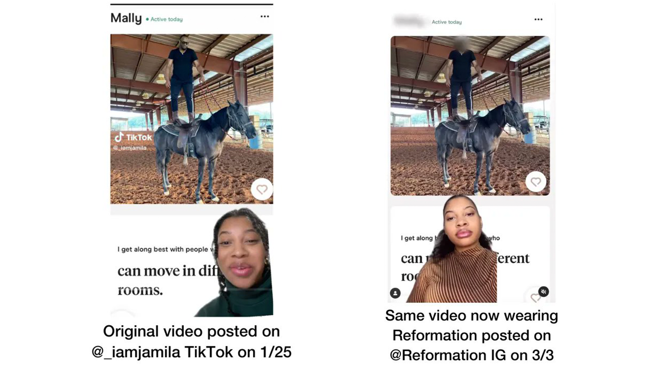 Reformation’s Instagram feed contains various creators reproducing sketches, stunts, and hilarious videos that have gone viral on influencers’ feeds with a twist: they are wearing Reformation clothing. One example is @_iamjamila posting a video on TikTok, which received 1.3M views about her experience with dating apps, showing a Hinge profile of a man standing on a horse. This video is cloned by the original creator on Instagram for Reformation’s account and wearing the brand’s Bailey Knit Top. In another example, a similar popular TikTok video received over 1M views when recreated on the brand’s Instagram channel. This strategy is mutually beneficial to both the brand and the influencers. Recreating already popular content is a way for the brand to guarantee high engagement on its own channel while also introducing a new audience to these creators’ channels.